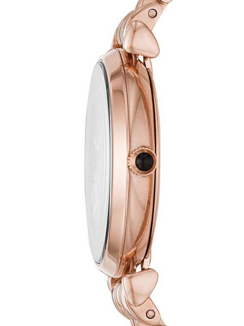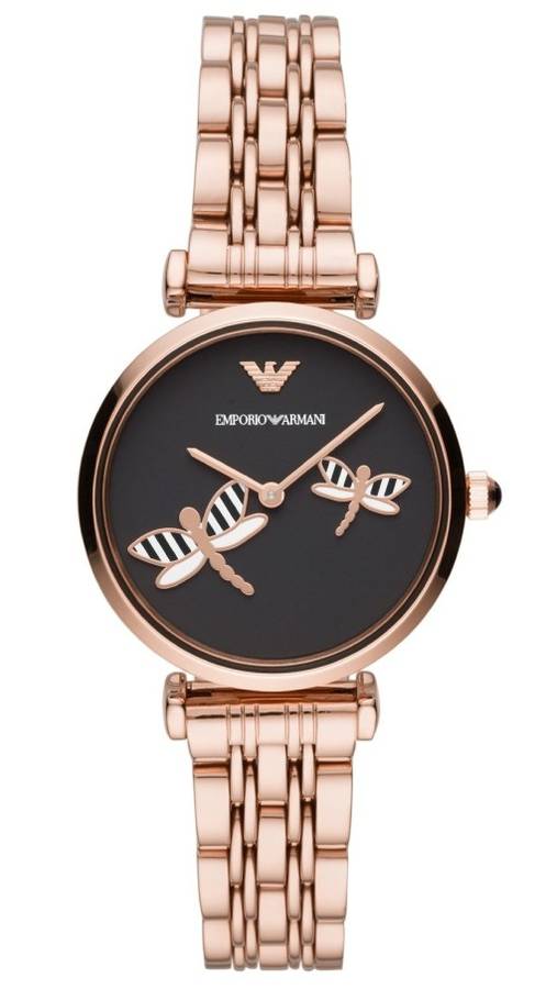 This 32mm watch features a matte black dial with black-and-white dragonfly motifs, two-hand movement and rose gold-tone stainless steel bracelet.