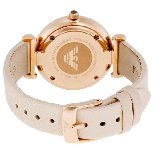 Rose gold tone stainless steel case with a pale- pink leather strap. Fixed bezel. Brown dial with rose gold-tone hands and index- Roman numeral hour markers. Dial Type: Analog. Quartz movement. Scratch resistant mineral crystal. Pull / push crown. Solid case back. Case size: 32 mm. Round case shape. Buckle clasp. Water resistant at 30 meters / 100 feet. Functions: hour, minute. Dress watch style. Emporio Armani Retro Ladies Watch AR1966.