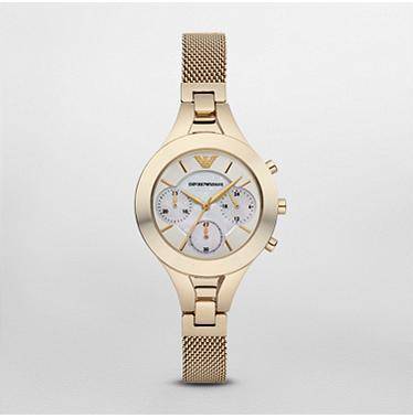 Featuring gold-tone, a matching mesh bracelet and a mother-of-pearl chronograph dial, this Emporio Armani watch showcases rich design with a versatile touch.