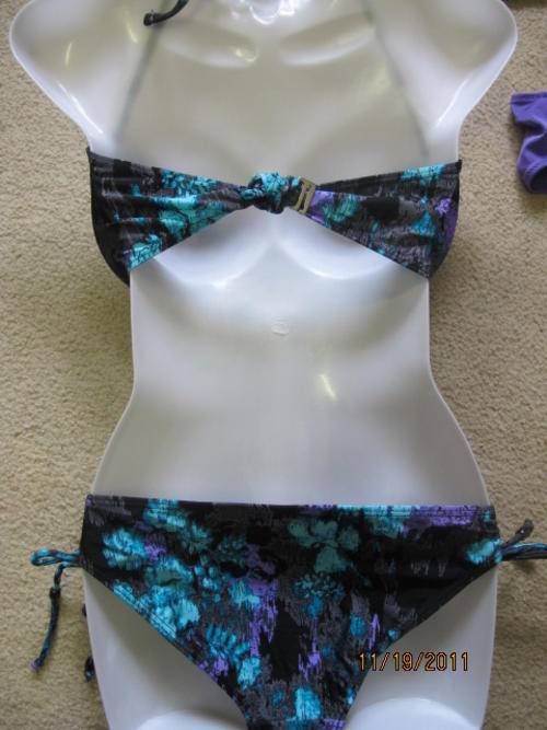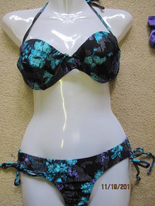 floral print color bikini, panty with beads at end of tie , bra padd,pad is un-removable,. nylon/spandex swimwear fabric . halter neck. Fashion of year , Orignal price $68.00.