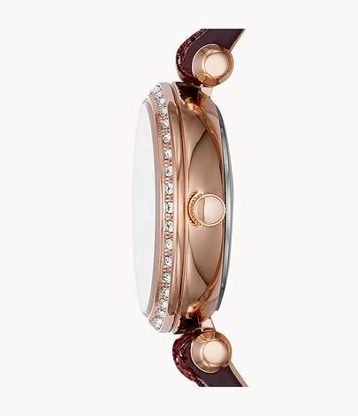 Rose gold-tone stainless steel case with a brown leather strap. Fixed rose gold-tone bezel set with crystals. Rose gold dial with rose gold-tone hands and index hour markers. A Roman numeral appears at the 12 o'clock position. Dial Type: Analog. Quartz movement. Scratch resistant mineral crystal. Pull / push crown. Solid case back. Round case shape. Case size: 26 mm. Case thickness: 8 mm. Band width: 10 mm. Tang clasp. Water resistant at 50 meters / 165 feet. Functions: hour, minute, second. Dress watch style. Fossil Tillie Mini Quartz Ladies Watch BQ3557.