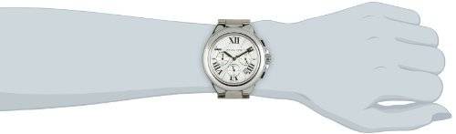 Stainless steel case with a stainless steel bracelet. Fixed stainless steel bezel. Silver dial with luminous silver-tone hands and alternating index and Roman numeral hour markers. Minute markers around the outer rim. Dial Type: Analog. Date display appears at the 6 o'clock position. Chronograph - three sub-dials displaying: 24 hours, 30 minutes and 60 seconds. Quartz movement. Scratch resistant mineral crystal. Pull / push crown. Solid case back. Case diameter: 43 mm. Case thickness: 13 mm. Round case shape. Band width: 20 mm. Band length: 7 inches. Push button deployment clasp. Water resistant at 100 meters/ 330 feet. Functions: hours, minutes, seconds, date, chronograph, GMT. Sport watch style. Michael Kors Bradshaw Chronograph Silver-tone Ladies Watch MK5535.