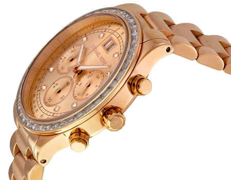 Rose gold-tone stainless steel case and bracelet. Fixed rose gold-tone bezel set with crystals. Rose dial with luminous rose gold-tone hands. Minute markers. Tachymeter around the outer rim. Dial Type: Analog. Luminescent hands. Date display below the 12 o'clock position. Chronograph - three sub-dials displaying: 60 second, 60 minute and 24 hour. Quartz movement. Scratch resistant mineral crystal. Pull / push crown. Solid case back. Case diameter: 40 mm. Case thickness: 10 mm. Round case shape. Band width: 20 mm. Deployment clasp. Water resistant at 50 meters / 165 feet. Functions: chronograph, tachymeter, date, hour, minute, second. Casual watch style. Michael Kors Brinkley Chronograph Rose Dial Rose Gold-tone Ladies Watch MK6204.
