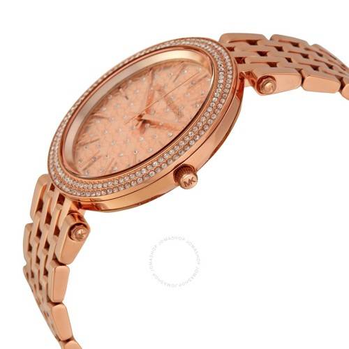 Rose gold-tone stainless steel case and bracelet. Fixed rose gold-tone bezel set with crystals. Rose crystal-set dial with rose gold-tone hands and index hour markers. Dial Type: Analog. Quartz movement. Scratch resistant mineral crystal. Pull / push crown. Solid case back. Case diameter: 39 mm. Case thickness: 7 mm. Round case shape. Band width: 12 mm. Deployment clasp. Water resistant at 50 meters / 165 feet. Functions: hour, minute, second. Casual watch style. Michael Kors Darcy Rose Dial Rose Gold-tone Ladies Watch MK3399.