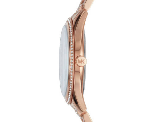A sleek three-link-bracelet with glitz detailing down the center and sparkling crystal topring make the rose gold-tone Michael Kors Lauryn this season's most irresistible timepiece. The celestial-inspired burgundy sunray dial features a pavé half dial and pavé inner rings on the other half.