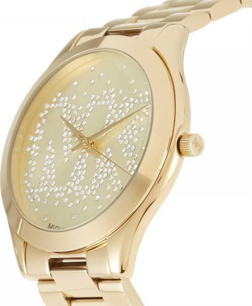 Gold tone stainless steel case with a gold tone stainless steel bracelet. Fixed bezel. Gold tone dial with gold-tone hands. Dial Type: Analog. Quartz movement. Scratch resistant mineral crystal. Pull / push crown. Solid case back. Case size: 39 mm. Round case shape. Deployment with push button release clasp. Water resistant at 50 meters / 165 feet. Functions: hour, minute, second. Dress watch style. Michael Kors Slim Runway Gold Tone Ladies Crystal Watch MK3590.
