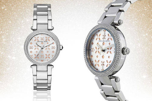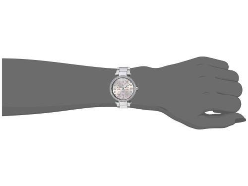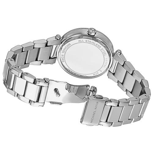 Silver stainless steel case with a silver stainless steel bracelet. Fixed bezel. Silver dial with silver-tone hands and index hour markers. Dial Type: Analog. Quartz movement. Scratch resistant mineral crystal. Pull / push crown. Solid case back. Case size: 33 mm. Case thickness: 11 mm. Round case shape. Band width: 10 mm. Water resistant at 100 meters / 330 feet. Functions: hour, minute, second. Casual watch style. Michael Kors Mini Parker Silver Dial Ladies Watch MK6483.