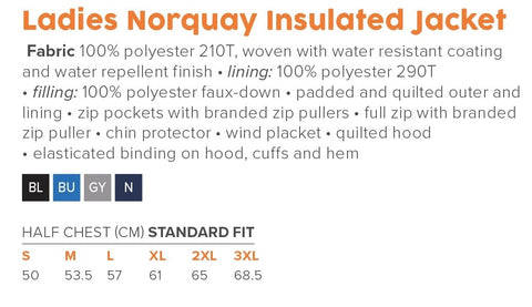 The Norquay is a stylish look for autumn to winter. A combination of lightweight warmth and trendy retail styling, the Norquay provides protection from the elements with 100% polyester faux down insulation, an attached hood, interior storm flap with chin guard and water-repellent finish. It also features contrast binding on the cuffs, hem and hood opening for men's. The women's style has a dropped back hem with shaped seams and a tapered waist for a more natural fit. With its retail look and decoration-friendly back-shoulder panel, the Norquay will command attention for any brand. FABRIC OUTERSHELL: 100% Polyester 290T woven with water resistant (600mm) coating and water repellent finish, 60 g/m². LINING: 100% Polyester 290T. INSULATION: 100% Polyester faux down fill total of body, sleeves and hood. WARMTH RATING:Warmth Level 2 - Cold/Urban Winter Day (0C to -15C/ 32F to 5F)**