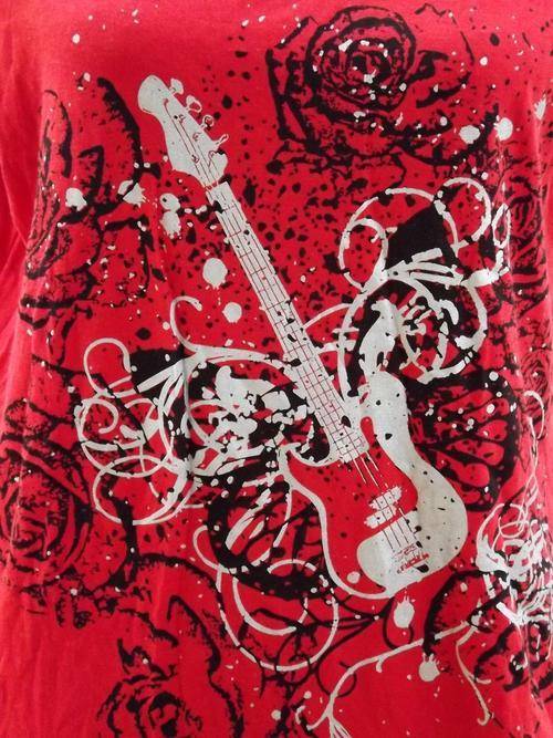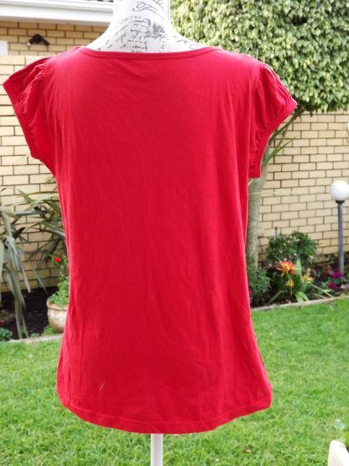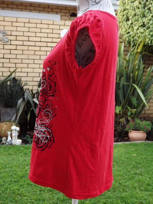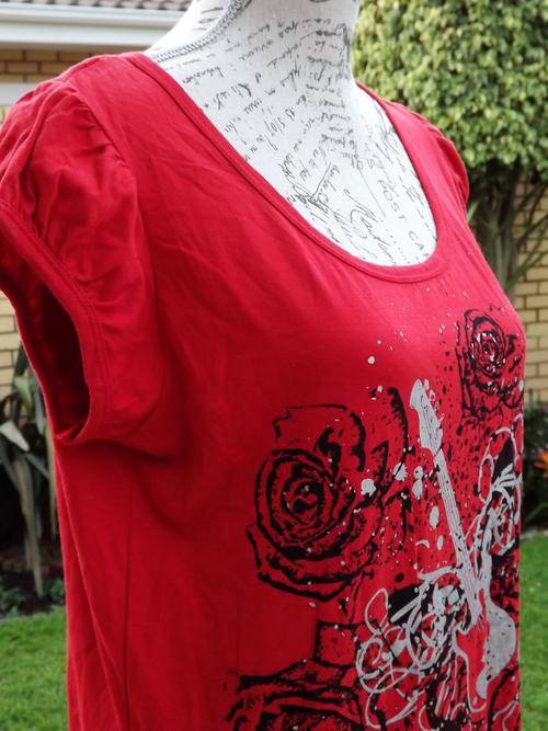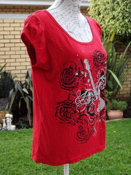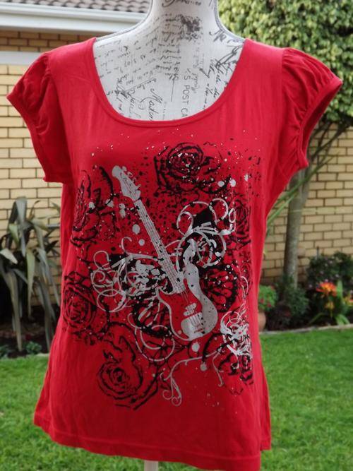 ONE LADIES RED CAPPED SHORT SLEEVE T -SHIRT WITH FUNKY BLACK AND SILVER ABSTRACT GUITAR PRINT ON THE FRONT . NEW, NEVER BEEN WORN. IN PERFECT NEW CONDITION. SOMETHING THAT WILL LOOK GOOD WITH YOUR FAVOURITE DENIMS, CASUAL CROPPED PANTS OR SHORTS. PERFECT FOR SUMMER ! SIZE LARGE.