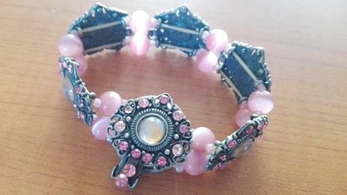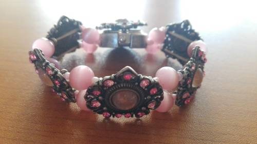 Made from Lucite Beads and Crystals, this pretty-in-pink stretchy watch offers a "cover" for its face.