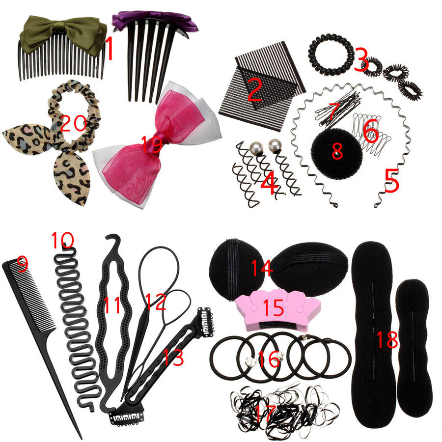 Description: Type: Hair Styling Clip Accessory Maker Tool Color: As the picture shown Hair accessories material: Plastic, sponge, metal Package Included: 1. Bow hair clip x 2 2. Bangs posted x 2 3. Wire bangs x 4 4. Screw clamp x 4 5. Wavy hair hoop x 1 6.The invisible princess head bangs hair plug x 2 7. Multi-function U-shaped clip x 10 8. Donuts x 1 9. Beak beauty comb x 1 10. Centipede dish made x 1 11. The double hook plate pattern hair x 1 12. Pull pattern hair pins x 2 (1 large &1 small) 13. Bobo head dish hair x 1 14.The additional pad Punta hair x 2 (1 large &1 small) 15. Hair braider x 1 16. Elastic rubber x 5 17. Small rubber band x 1 box (about 60pcs/box) 18. Pull pattern hair pins x 2 (1 large &1 small) 19. Bow Comb Clip x 1 20. Hairband x 1 Notes: 1. The real color of the item may be slightly different from the pictures shown on website caused by many factors such as brightness of your monitor and light brightness. 2. Please allow slight deviation for the measurement data.