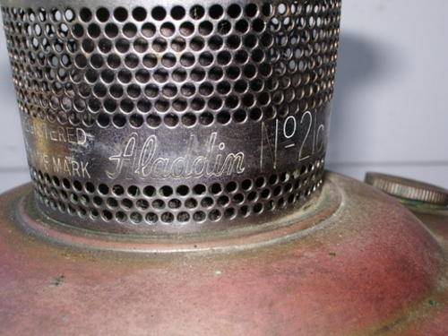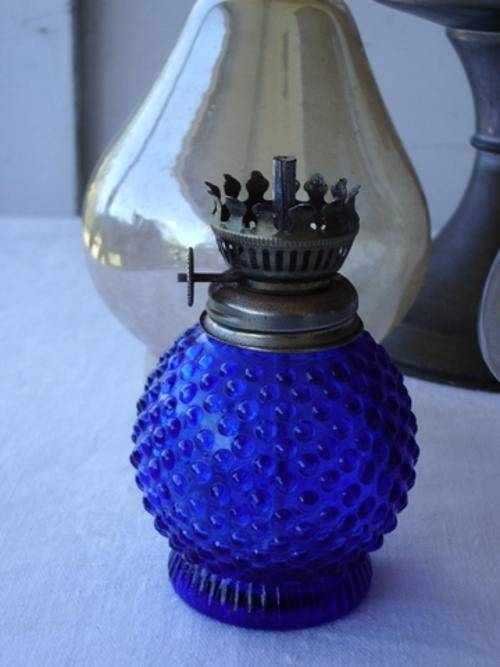 LAMP ENTHUISIASTS! AN ALLADIN LAMP, A BLUE HOBNAIL LAMP AND FOUR GLASS FLUES - AS ONE LOT.