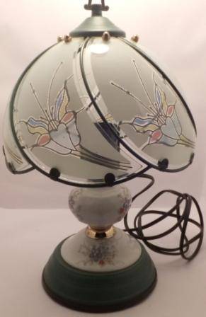 Lamp with decorated glass top and stand. The dark green parts are a lightweight powder coated dark green thin metal and the bottom black rim is a plastic end cover. The cord has a 2 pin plug attached. No visible damage or wear and tear.