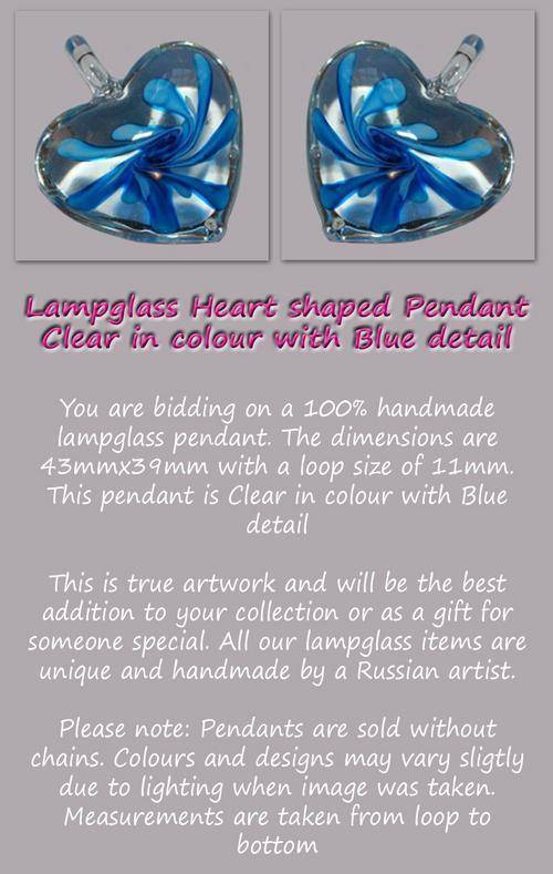 Lampglass Heart shaped Pendant Clear in colour with Blue detail