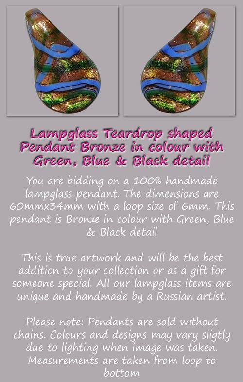 Lampglass Teardrop shaped Pendant Bronze in colour with Green, Blue & Black detail