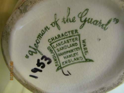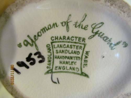 STAMPS/MARKS ETC : THE ITEM IS STAMPED UNDERNEATH - "YEOMAN OF THE GUARD, SANDLAND CHARACTER WARE, LANCASTER SANDLAND, HANDPAINTED, HANLEY, ENGLAND" "1953" IN BLACK