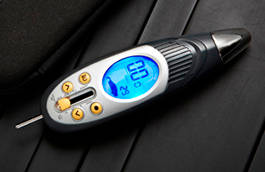 Stores recommended pressure and has a unique 360° rotating nozzle to locate tire valve, LED light, tread depth gauge, measuring in psi, bar, kpa, Kg/Cm2 and comes complete with storage case.