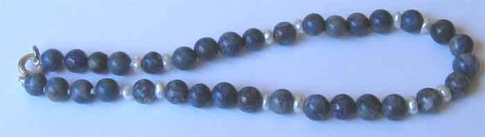 weight 6.33 grams , iterspaced with 3.00 mm white pearls and has a 6.00mm and has a silver bolt ring clasp.not very good colour but genuine stones