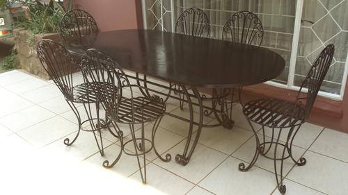 Large 6 seater wrought iron patio set. Solid, heavy and perfect for that family get together. In very nice condition. Can be left outside and will take decades to rust through.