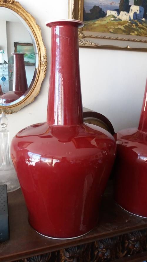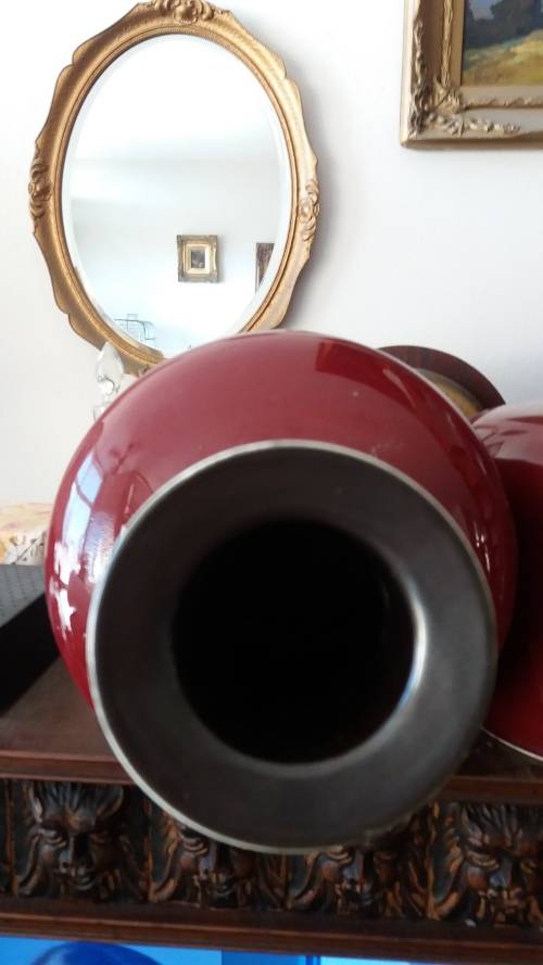 This ox blood red vase is large and heavy and is in excellent condition. It stands at approx 52cm high and the circumference is approx 84cm at it's widest point. The marks you see on the vase are reflections from the light. It has Chinese marks on the base. I don't know it's age, possibly vintage or older but not sure. It would make a lovely lamp. Please NOTE that due to the weight of this vase (approx 6kg) it's not advisable to send it in the post. So it's COLLECTION ONLY. Please look at the pictures as they form part of the description. Payment within 3 days after close of auction. Thanks for looking