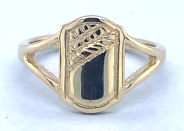 A shield signet ring featuring bright cutting; 10mm long (top to bottom).