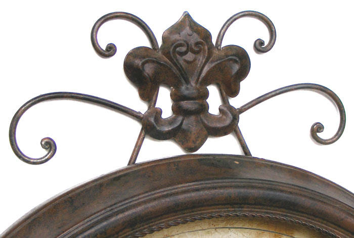 The frame and hinged scroll at the top is made from thin metal with an antique finish.