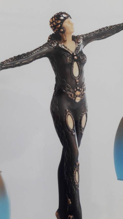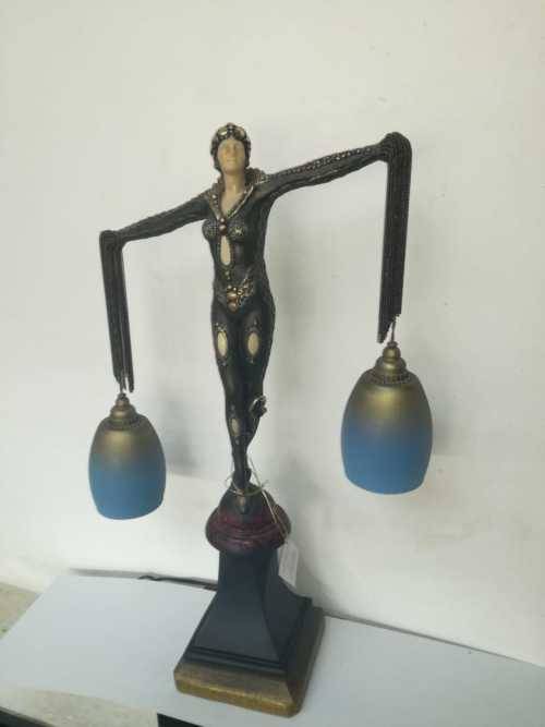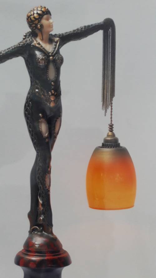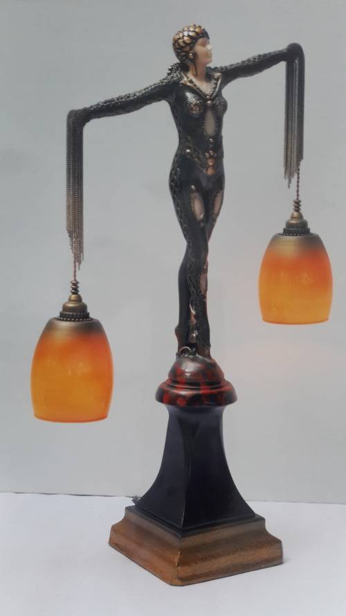 Offered for sale is a large Art Deco style figural table lamp titled "Victoria" with the central support styled as an exotic sensual female figure with outstretched arms which support two pendant shades. This is a contemporary limited edition, made to order item designed by the artist Alex Veltchev resident in Johannesburg . The lamp is made from a marble dust resin compound with ivorine insets for the face and body and delicate metal chain mail detailing on the arms . The styling of the figure is based on 1920's Art Deco French prototypes by artists such as Gerdago , Phillipe , Bouraine ,Chiparus etc. The exotic costume of the lady is reminiscent of futuristic fashions worn by dancers at the Follies Bergere or early silent movies with a close fitting skull cap/cloche,a body suit with erotic cut outs and intricate beading and detailing. This is a large statement piece which would complement a well styled contemporary, eclectic home or a period home with antique furniture. The size is approximately 50cm high and 30cm wide. Please allow approximately 7-10 days for delivery as this is a made to order item. The lamp is available with glass shades in a blood orange tangerine colour or sky blue or a colour specified by the buyer . As each piece is unique the hand painted detailing on the figurine and base varies. Courier delivery is recommended at approximately R160 for delivery to major cities in SA.