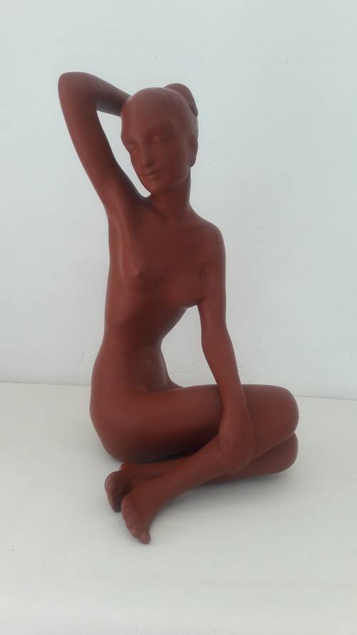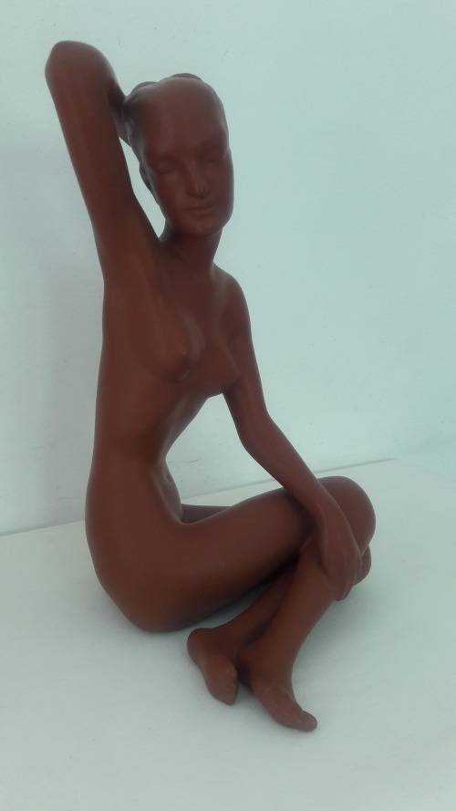 Offered for sale is a large ceramic seated female nude figurine by the Austrian manufactory Gmundner Keramik. The figurine dates to circa the 1940's/50's and is designed and modelled by Alfons Steiner . Similar examples are listed on Ebay for prices around 165 US dollars . This item is slip cast from a mold and is made from earthenware with a terracotta glaze/paint finish. The figurine has impressed marks on the base viz J2393 probably a manufacturers code for the form/shape. Postage for this item is R140 via Postnet or Courier Guy delivery to major cities in SA. Collection is welcome from Emmerantia Jhb.