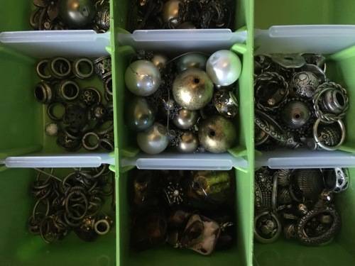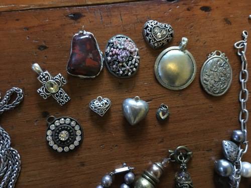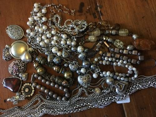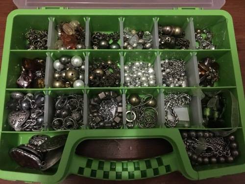 Large box with lots of beads, hooks, pendants, complete and incomplete necklaces etc - See pictures