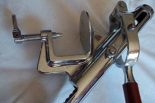 Large Chef Depot bar top lever corkscrew. This lovely large bar top lever corkscrew is chromed with a wooden handle and glass bottle guide. It is large and heavy, and clamps down on the bar counter for use. It works bu pushing the handle up, inserting the neck of the wine bottle into the guide and then pulling the handle down and pushing back up to extract the cork. It is in good working condition - the bottom clamping plate is missing but it firmly fastens to the bar. Great buy for your mancave.