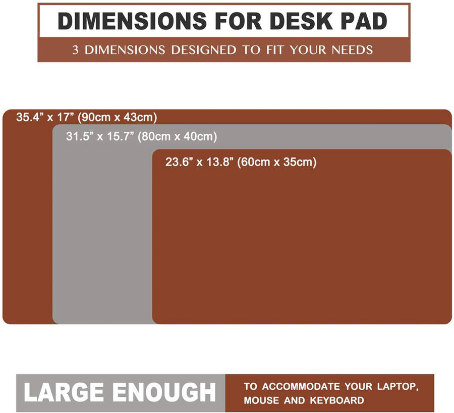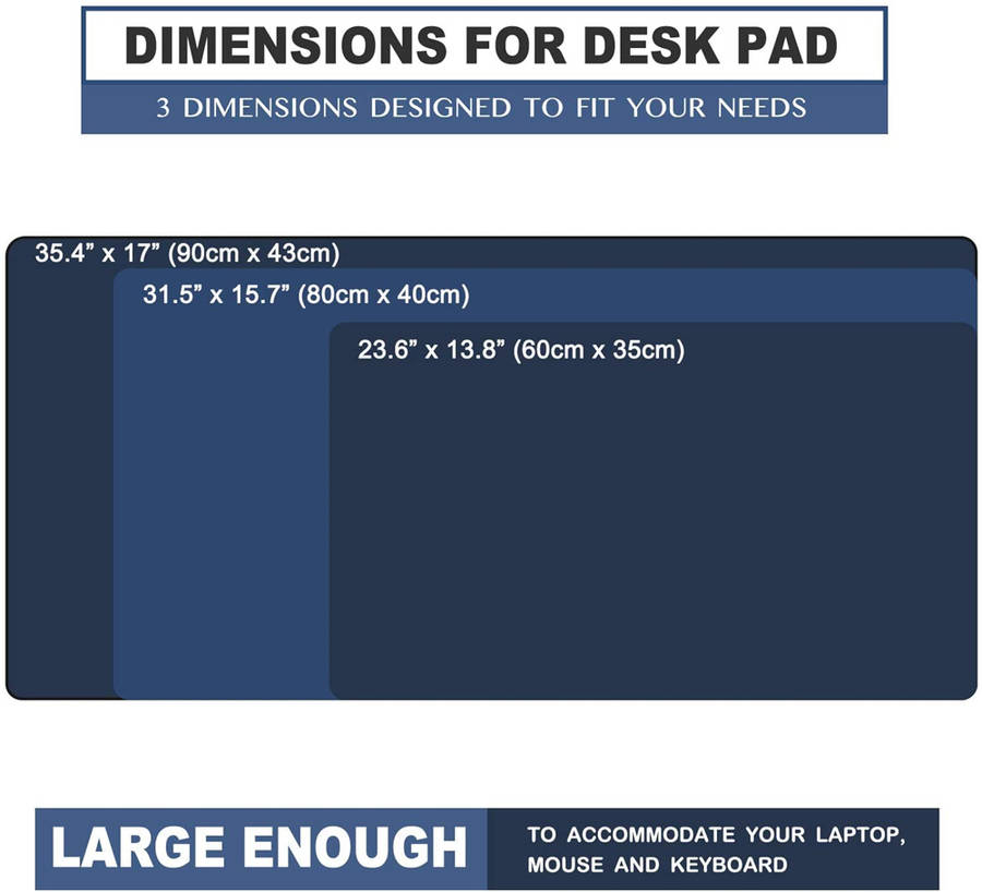 3. MULTIFUNCTIONAL DESK PAD Size 23.6 x 13.8 / 31.5 x 15.7 / 35.4 x 17, which is large enough to accommodate your laptop, mouse and keyboard. Its comfortable and smooth surface can be a mouse pad and a writing pad. Its non-slip material also adds stability during everyday use.