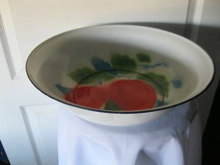 You are bidding on a Vintage large enamel basin decorated with red plumbs and edged in blue, the basin would look stunning filled with fruit in any kitchen, the basin is 36cm dia x 10cm high.