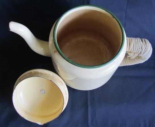 ![]() Bid with Confidence DUE TO HIGH POSTAGE COST I RECOMMENDED COMBINING WITH OTHER ITEMS. Large Enamelware Tea Pot About 18cm in height and 13cm in body diameter. Rope tied around handle to avoid hands from burning. ![]() |