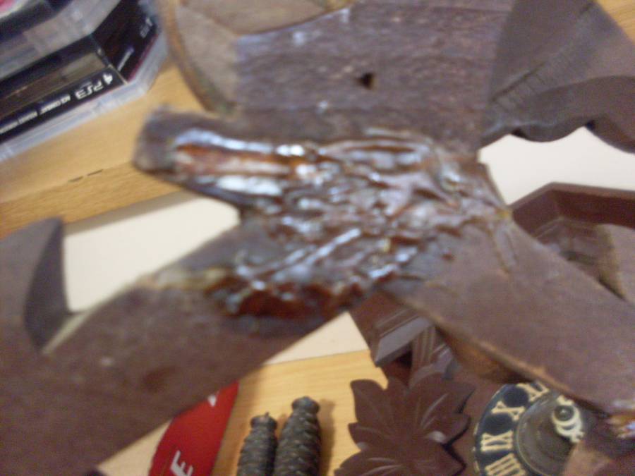 LARGE GERMAN CUCKOO...WORKING.... 50 CM X 29 CM X 15 CM ...SEE MAKERS MARK HAS WEIGHTS PENDULUM AND CHAINS PLEASE NOTE DECORATIVE TOP PIECE OF CUCKOO HAS BEEN REPAIRED...SEE PICS FOR DETAIL