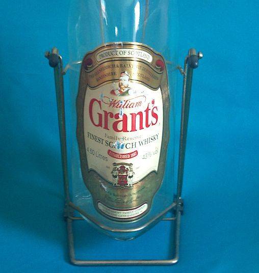 LARGE GRANT'S SCOTCH WHISKY GLASS LIQUOR BOTTLE ON ORIGINAL STAND.