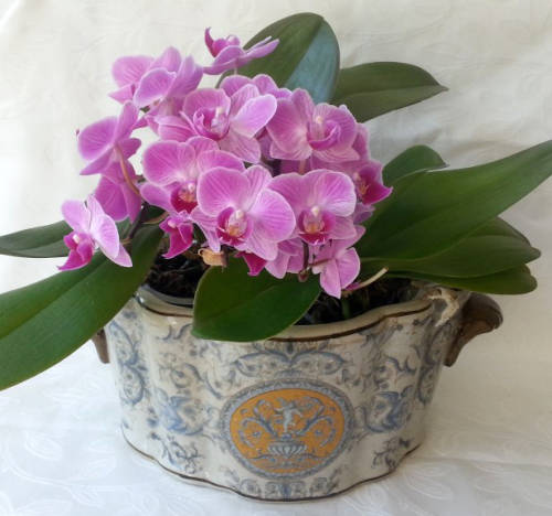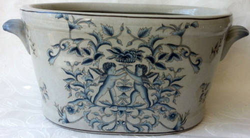 BEAUTIFUL STONEWARE, BLUE AND OFF WHITE, ALL OVER DESIGN WITH FINE CRACKLE EFFECT, POT PLANT HOLDER WITH PLAYFUL CHERUBS / ANGELS AND HANDLES, THE CONTAINER HAS A LOVELY SCALLOPED SHAPE AND THE INSIDE IS WELL DECORATED AS WELL THERE IS NO DAMAGE, CHIPS OR CRACKS.....HEIGHT 15cm, LENGTH 29cm, NOT INCLUDING HANDLES. WIDTH 22cm. AS NEW CONDITION.