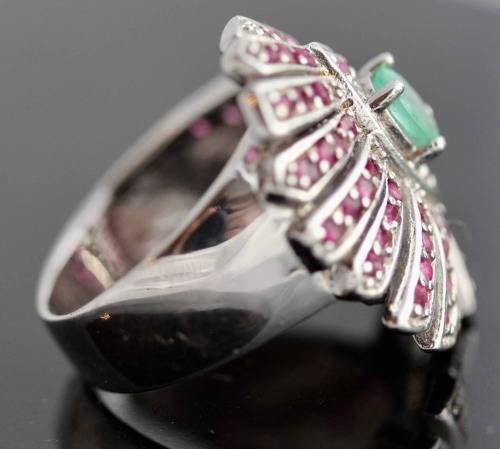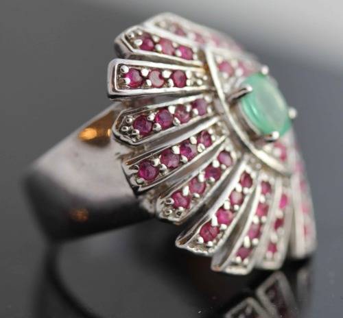 Beautifully made and a really solid piece of jewellery, this rather unusual showy ring features a gorgeous fan-like design feature, multiple strands of solid sterling silver packed together with the air of the opening tail on an exotic bird. Each strand has been studded with natural pink rubies in a row, claw set and round cut. The central feature of the ring head brings the design elements together around a natural Brazilian earth-mined softly faceted oval emerald of a gentle green hue. The colour combination of the silver against the deep pinks and the soft green is pretty and unusual. Its a big ring ... 27 x 22 mm on the ring head and softly domed to present 9 mm above the finger. The ring is a wonderful snug fit as a result of the fan-like shape curving all the way around the ring head from one side to the other. It weighs in at a hefty 9,8 grams. The silver is solid and gemstones are all natural.