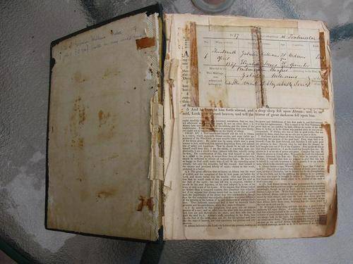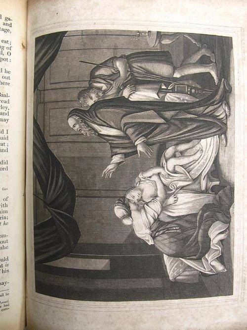 This lovely old family Bible is from the 1830's, due to the fact that it was printed by John Childs and Son and at the beginning of the New Testament, it states London: George Virtue, 26, Ivy Lane, Paternoster Row. It is "embellished with many beautiful engravings". It has an original wedding certificate taped onto the front page (the wedding of Zabulon Williams to Elizabeth Jones in Pontmorlais Wales in 1857). It contains the full Apocrypha. Unfortunately the beginning pages are missing and therefore only starts at Genesis XV. Also the back pages are missing, ending at Revelations XIII. The fishmoths have damaged the cover slightly and the pages are browned with age and, it appears, heat. Other than the above, in good condition for a book of about 200 years.