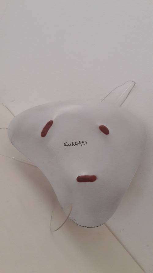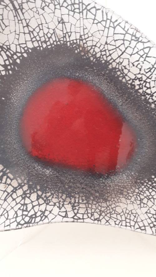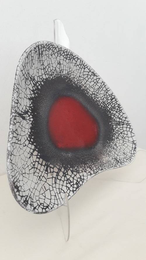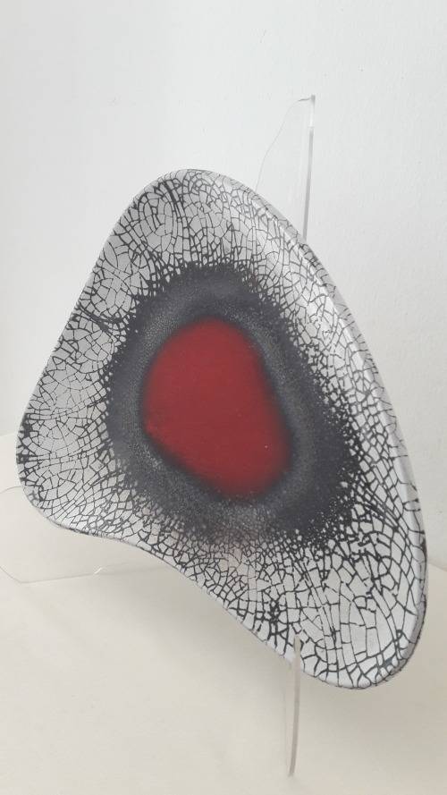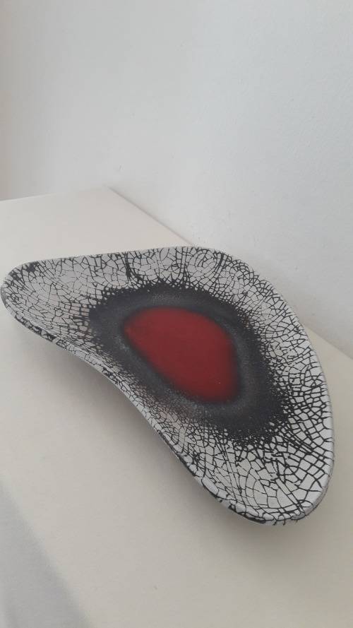 Offered for sale is an exceptional Kalahari studio ceramic freeform platter with a bold abstract motif centering on an eye catching red elliptical target motif enclosed by a sophisticated textured and granular glaze border in charcoal and a radiating craquelure pattern of black on white . The platter is made from a red bodied clay glazed in a crisp arctic white base colour. The shape is a triangulated freeform palette or boomerang slightly convex when resting flat on a table and supported by three small stub feet. The platter is signed on the reverse with the studio name. Kalahari ceramics were hand made and designed by a super talented husband and wife team Aleksanders and Elma Klopkanov expatriate Latvians who emigrated to South Africa in the 1940's and settled in the Cape working from a studio in Constantia Hoek. Their ceramic art is keenly collected and increasingly hard to find ; they are widely regarded as amongst the most original and finest designers of Midcentury ceramics in South Africa.