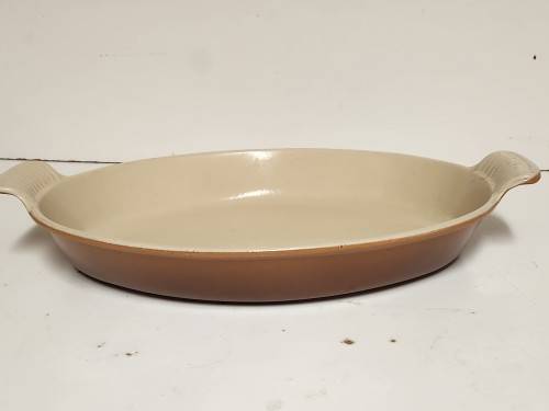 LARGE LE CREUSET MADE IN FRANCE ENAMELED CAST IRON TWIN HANDLED OVEN DISH, MARKED 32. THIS OVEN DISH IS IN A GOOD PRE-USED CONDITION, STRUCTURALLY SOUND WITH NO CHIPS OR CRACKS. IT MEASURES 6 CM HIGH, 37 CM HANDLE TO HANDLE AND 23.5 CM WIDE. (PLEASE VIEW MY OTHER LISTINGS FOR MORE LE CREUSET ITEMS)