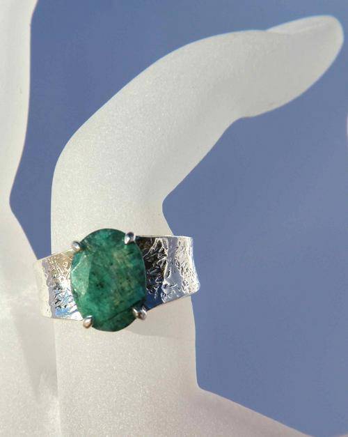 LARGE NATURAL SEA-GREEN EMERALD IN BROADBAND STERLING SILVER RING! 4,6 grams. Size 8