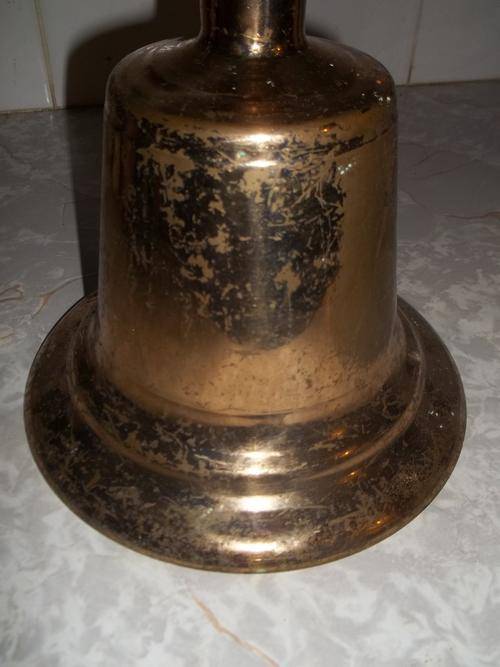GENUINE OLD SCHOOL BELL WITH WOODEN HANDLE. SMALLER BELL FITTED AS A GONG. QUITE HEAVY. SIZE; 31 X 19,5 CM.