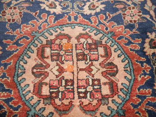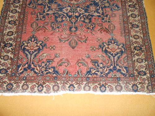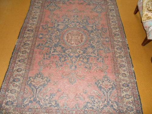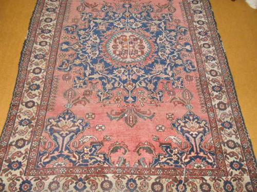 LOVELY OLD ORIENTAL CARPET IN REDS AND BLUES AND MEASURING 186CM BY 134C. HAS A SMALL REPAIR IN CENTRE AS SHOWN IN PHOTO, SHABBY CHIC BUT PRICED ACCORDINGLY. PLEASE NOTE BUYER TO ARRANGE COLLECTION AT OWN COST AND BETWEEN THE HOURS OF 7A.M. AND 4 P.M. WEEKDAYS ONLY AS WE DO NOT HAVE A COURIER SERVICE.