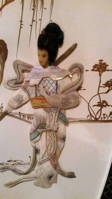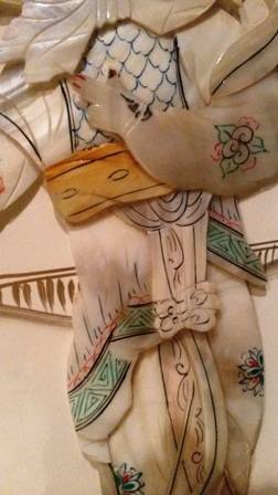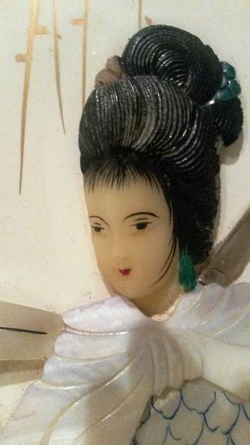 stunning large vintage wall plaque 3D mother or pearl that's hand painted - its and very unusual just under a metre high - the paint has crackled with age but thats an age relevant condition nothing major small chip on base of frame also not bad