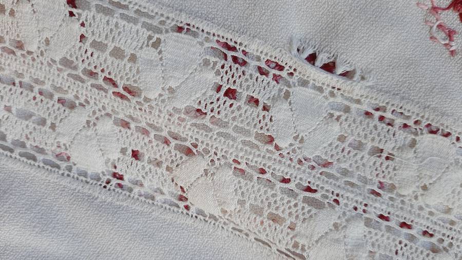 This is a magnificent table cloth. - Pale pink, hand embroidered tablecloth (cm) with white lace insets and edging. It has a few small breaks (see photo).