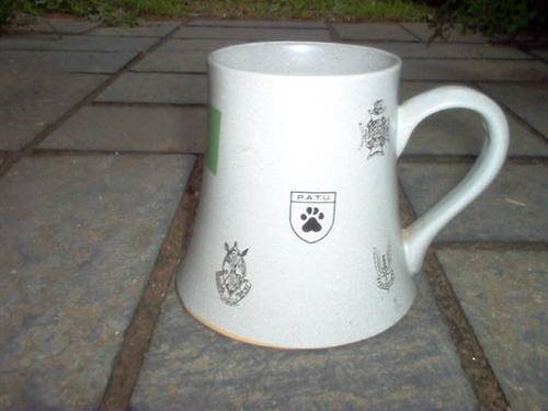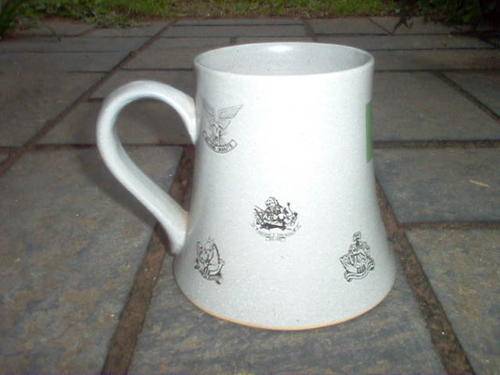AN INTERESTING OLD RHODESIAN BEER TANKARD DECORATED WITH VARIOUS SHIELDS OF THE COUNTRY INCLUDING SELOUS SCOUTS, RHODESIAN AIR FORCE, P.A.T.U.AND SOME OTHERS..IT MEASURES 12.5CM HIGH AND 13CM IN DIAMETER ACROSS THE BASE. MAIN SHIELD FLANKED BY GREEN SQUARES IS RHODESIA 1890--1979. THERE ARE NO MAKERS MARKS,