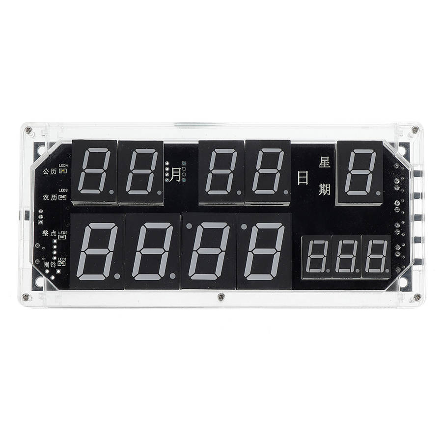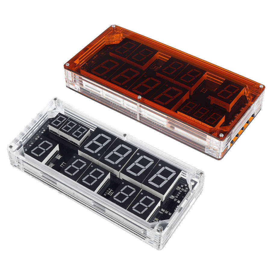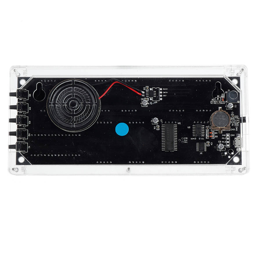 Name: Big screen voice clock production kit Functional characteristics: stc single-chip computer +8025+ voice playback 1. Simultaneously display the current date, week, time and temperature for easy viewing. 2. Large-size digital tube display (date, week 0.8 inches; time 1.0 inches; temperature 0.56 inches). 3. Time and temperature precision: The time IC uses RX-8025AC, with a built-in frequency adjustment 32.768khz crystal oscillator ±5*10-6. The temperature IC is DS18B20 with an error of 0.5ᆪC. Positive and negative temperature display, positive temperature display accuracy is 0.1a, negative temperature display accuracy is 1a. 4. Gregorian calendar and lunar calendar display and switch automatically (10s). 5. Voice timekeeping function (automatic timekeeping on the hour, manual timekeeping by pressing the button). 6. Hourly timekeeping function: the hourly timekeeping function can be turned on and off. 7. Alarm clock function: turn on and off the alarm clock function. 8. Countdown function (maximum countdown time 99 hours 99 minutes 250 seconds) 9. Brightness automatic adjustment function (from 7 am to 9 pm, daytime brightness; 10 pm to 6 am, night brightness) Without shell size: 180mm *26mm * 80mm(length* wide *high) With shell size: 180x82x25mm Weight with case: 295g Working voltage: 5V (powered by mobile phone charger and Android data cable, power bank, usb port) S