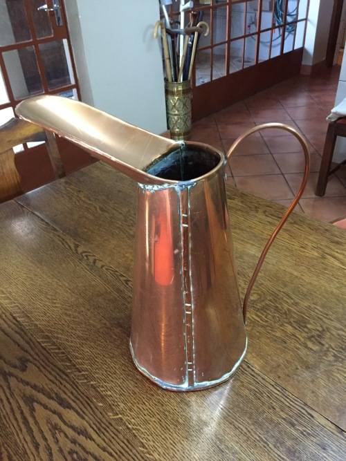 Large solid copper jug with copper handle manufactured in South Africa in 1980's; diameter at base is 19 cm; height from base to highest point on spout is 39 cm; width from end of spout to back of handle is 36 cm; this item is very decorative because of it's size. For pick up in Pretoria only unless otherwise discussed with seller.
