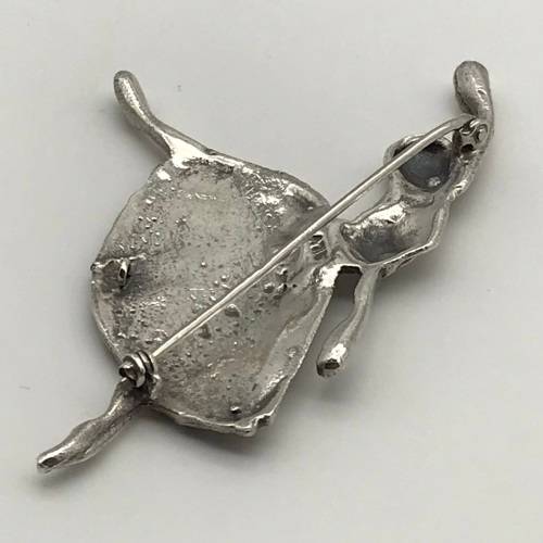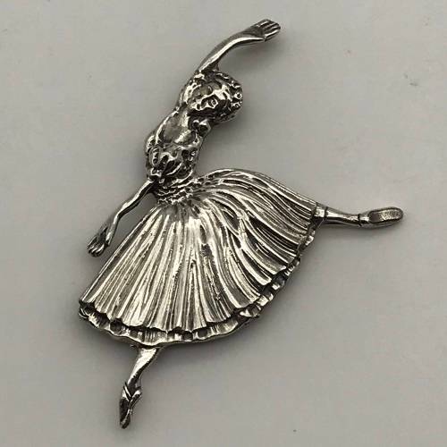 This wonderful, 1950/60's sterling silver brooch in the form of a dancing ballerina, is very well made with a nice thickness and lovely detail. The brooch is in excellent condition, has a secure pin with a roll-over safety clasp and is stamped 'SILV' on the back. It measures 5,7cm x 5,5cm and weighs 13,6g.