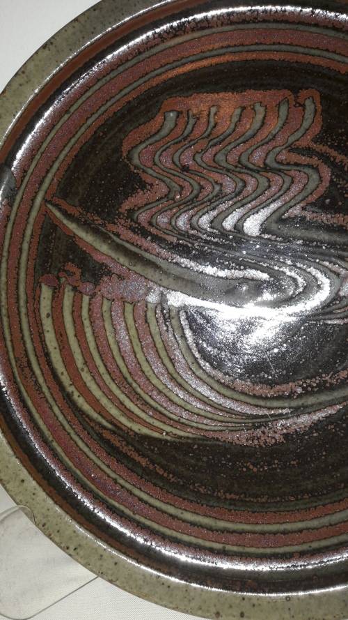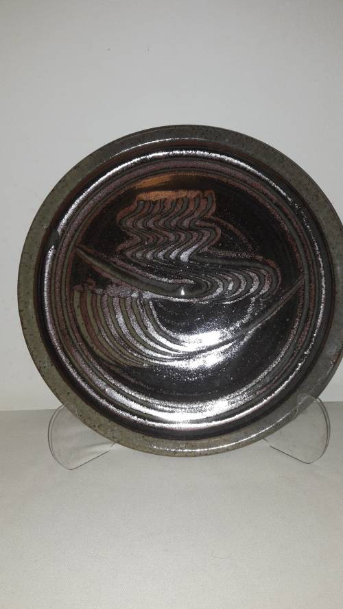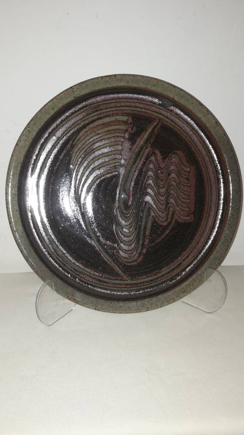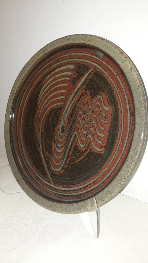 Offered for sale is a fine large stoneware charger made in Mthata, Eastern Cape (formerly Transkei) by the famous Izandla pottery studio. The piece is hand thrown and decorated ; it is made from an oatmeal coloured stoneware which is hand painted with a tenmoku and iron red slip with a distinctive combed ,swirled motif. The piece was most likely made during the tenure of Lindsay Scott famous Natal potter as Production Manager ie 1979-1984. The decoration is attributed to Cynthia Ngubo.